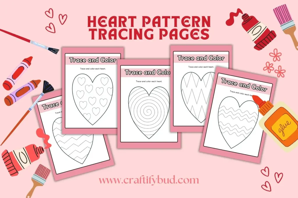 Tracing pages with heart patterns are calming and surprisingly popular. Children trace lines, follow curves, and build confidence in their writing skills — all while staying on theme.